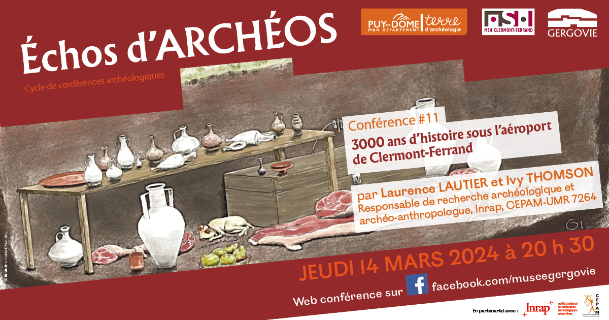 Jeudi 14 mars 2024, à 20h30, sur Facebook, Page Musée de Gergovie, Laurence Lautier, responsable de recherche archéologique à l’Inrap et chercheuse associée au CEPAM (UMR 7264), présentera ? 3000 ans d'histoire sous l'aéroport de Clermont-Ferrand ?. Préparée avec Ivy Thomson, archéo-anthropologue à l’Inrap et, elle aussi, chercheuse associée au CEPAM (UMR 7264), cette web conférence s'inscrit dans le cycle de rendez-vous ?chos d’Archéos proposé depuis mars 2021 par la Maison des Sciences de l'Homme de Clermont-Ferrand, le Musée Archéologique de la Bataille de Gergovie et le Département du Puy-de-D?me.