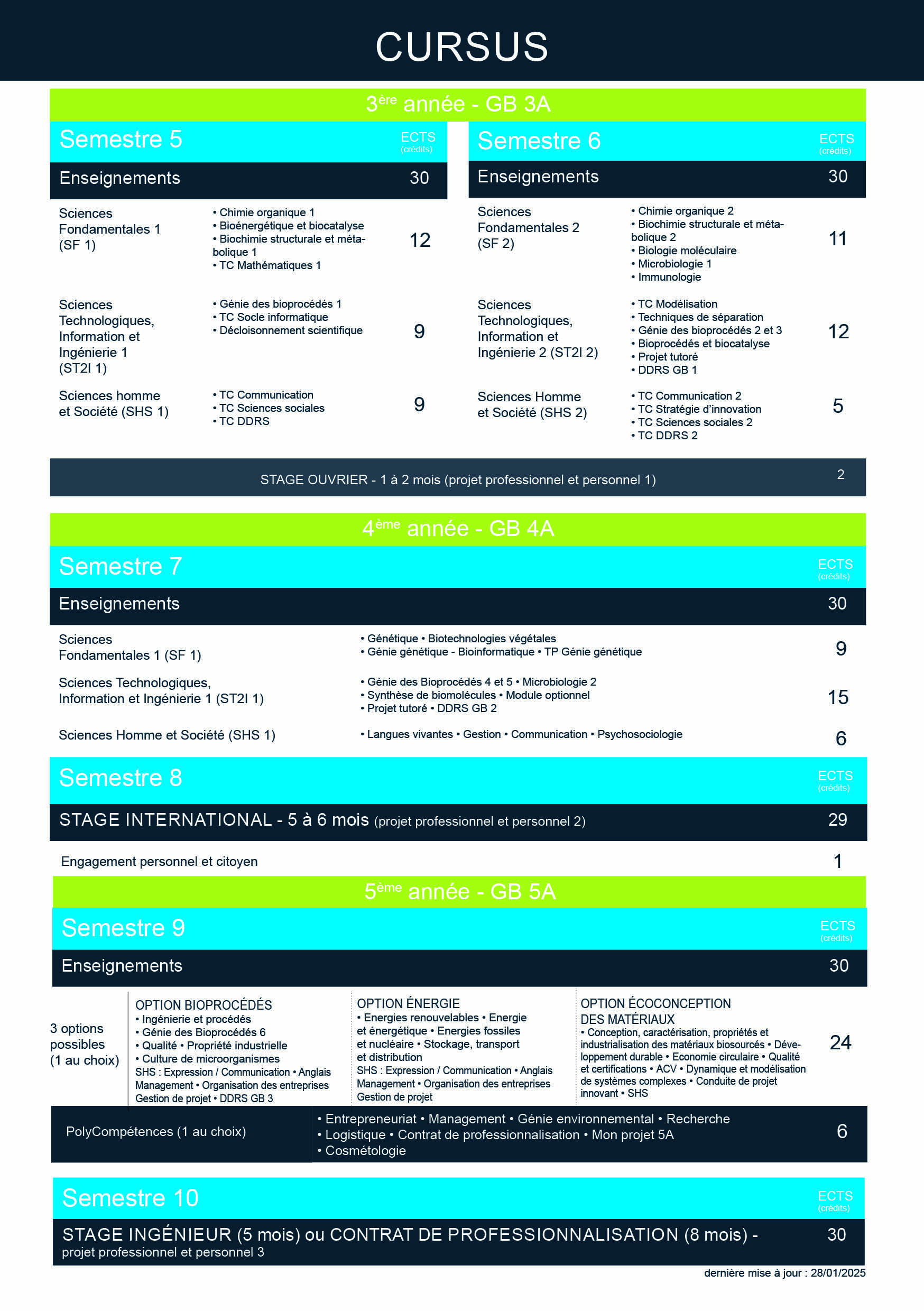 Le Génie Biologique est un champ disciplinaire très vaste qui couvre l'ensemble des étapes d'un procédé basé sur l'utilisation de matériel vivant ou issu du vivant. Les métiers émergents associés au domaine génie biologique intègre la compréhension, la conception et la mise en ?uvre de processus mettant en jeu des matériaux et des systèmes biologiques pour obtenir des produits utiles à la société. La maitrise de biotechnologies et bioprocédés durables, à l’échelle industrielle, est d’ailleurs un avantage compétitif pour des ingénieurs certifiés en génie biologique, qui doivent évoluer aux interfaces de nombreuses disciplines.
