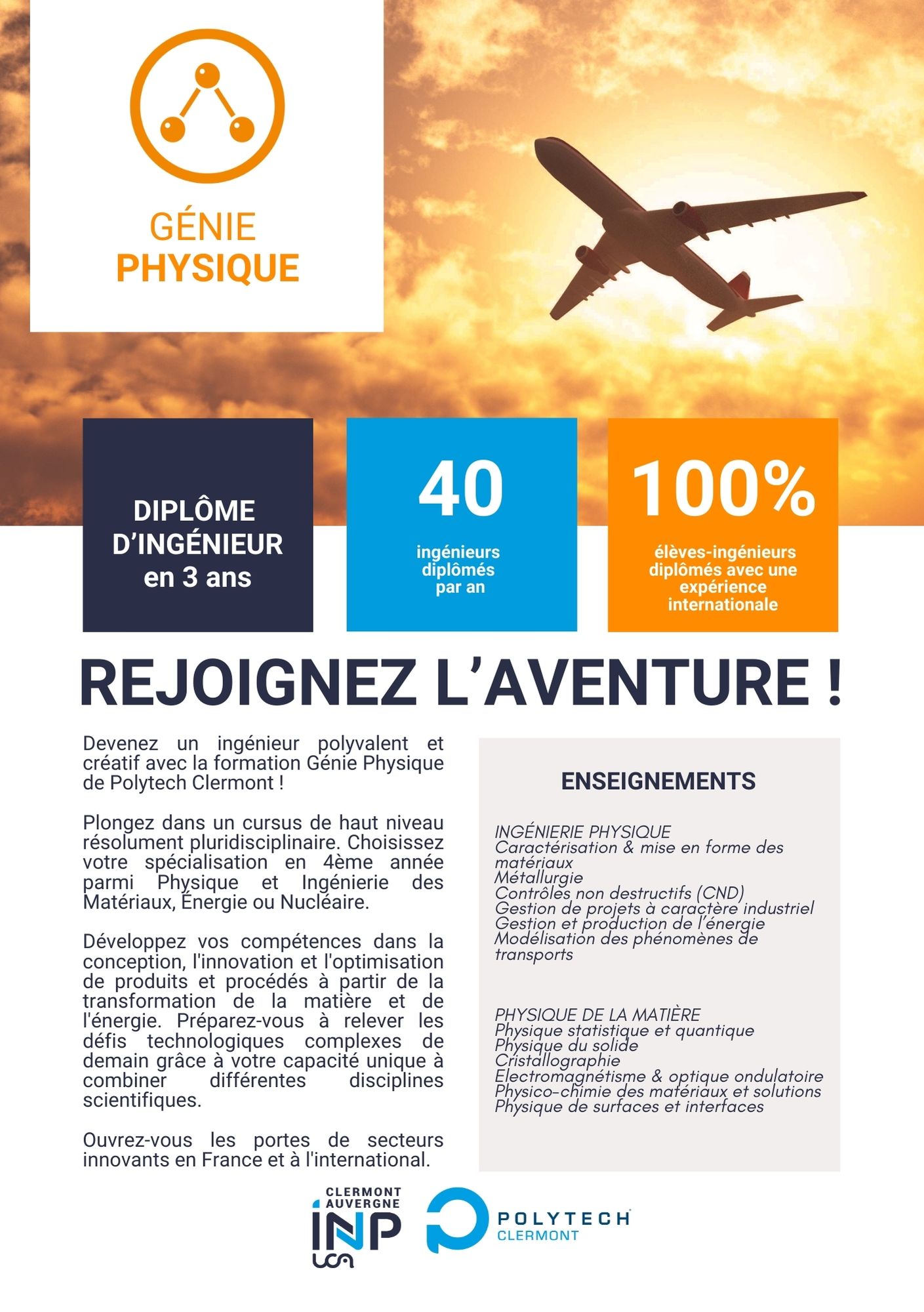 La formation Ingénieur Génie Physique de Polytech Clermont est une formation scientifique et technique qui recouvre un champ de compétences pluridisciplinaires très large dans le domaine de la physique pour la mise en ?uvre des matériaux. En savoir plusAccéder aux sections de la fiche