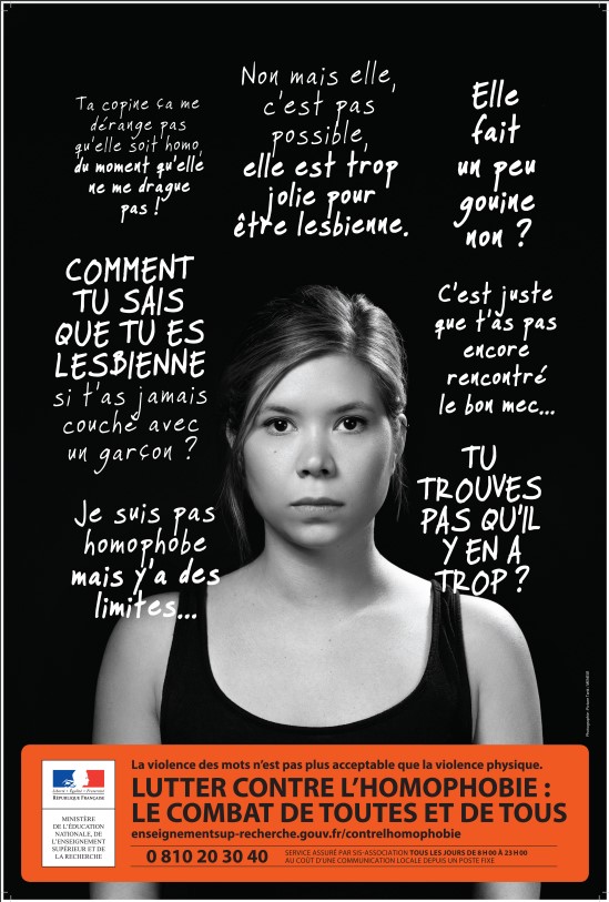 un jeu de quatre affiches qui reprennent des insultes ou propos communément entendus qui marquent profondément les étudiant-e-s gays, lesbiennes, bisexuels ou trans',