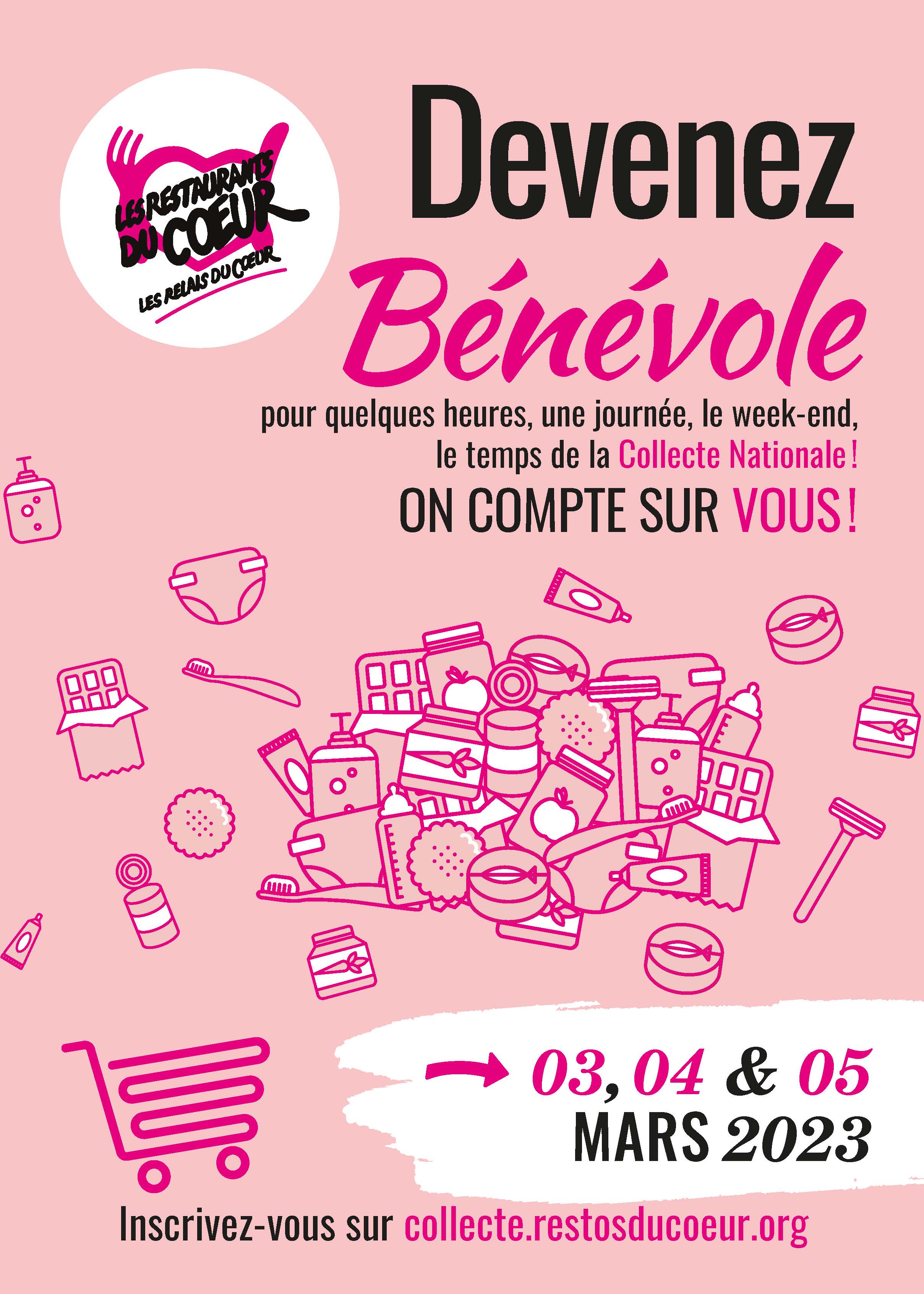 Du 3 au 5 mars 2023, les équipes bénévoles des Restos seront présentes dans plus de 7000 supermarchés dans toute la France pour collecter des denrées alimentaires et des produits d’hygiène.