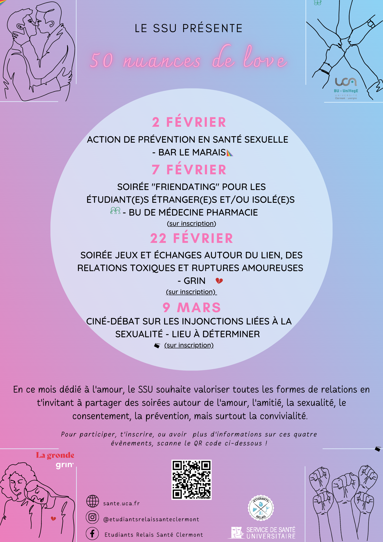 En ce mois dédié à l'amour, le SSU souhaite valoriser toutes les formes de relations en vous invitant à partager des soirées autour de l'amour, l'amitié, la sexualité, le consentement, la prévention, mais surtout la convivialité.
