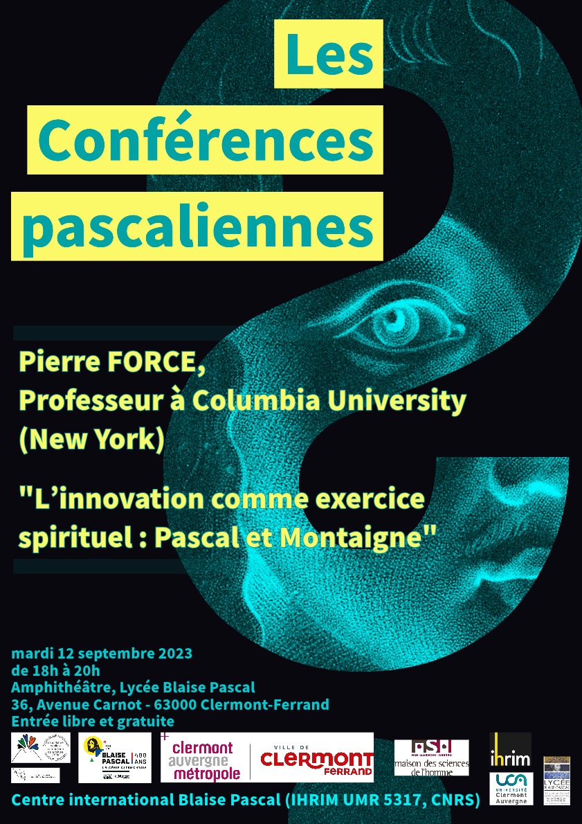 A l’occasion de la célébration du 4e centenaire de la naissance de Pascal, le Centre international Blaise Pascal de l’IHRIM propose un cycle de conférences : ? Les Conférences pascaliennes ?. Le 12 septembre 2023, à 18h00, dans l'amphithé?tre du Lycée Blaise Pascal, 36, avenue Carnot, à Clermont-Ferrand, Pierre Force, professeur à Columbia University (New York), interviendra sur le thème : ? L'innovation comme exercice spirituel : Pascal et Montaigne ?.