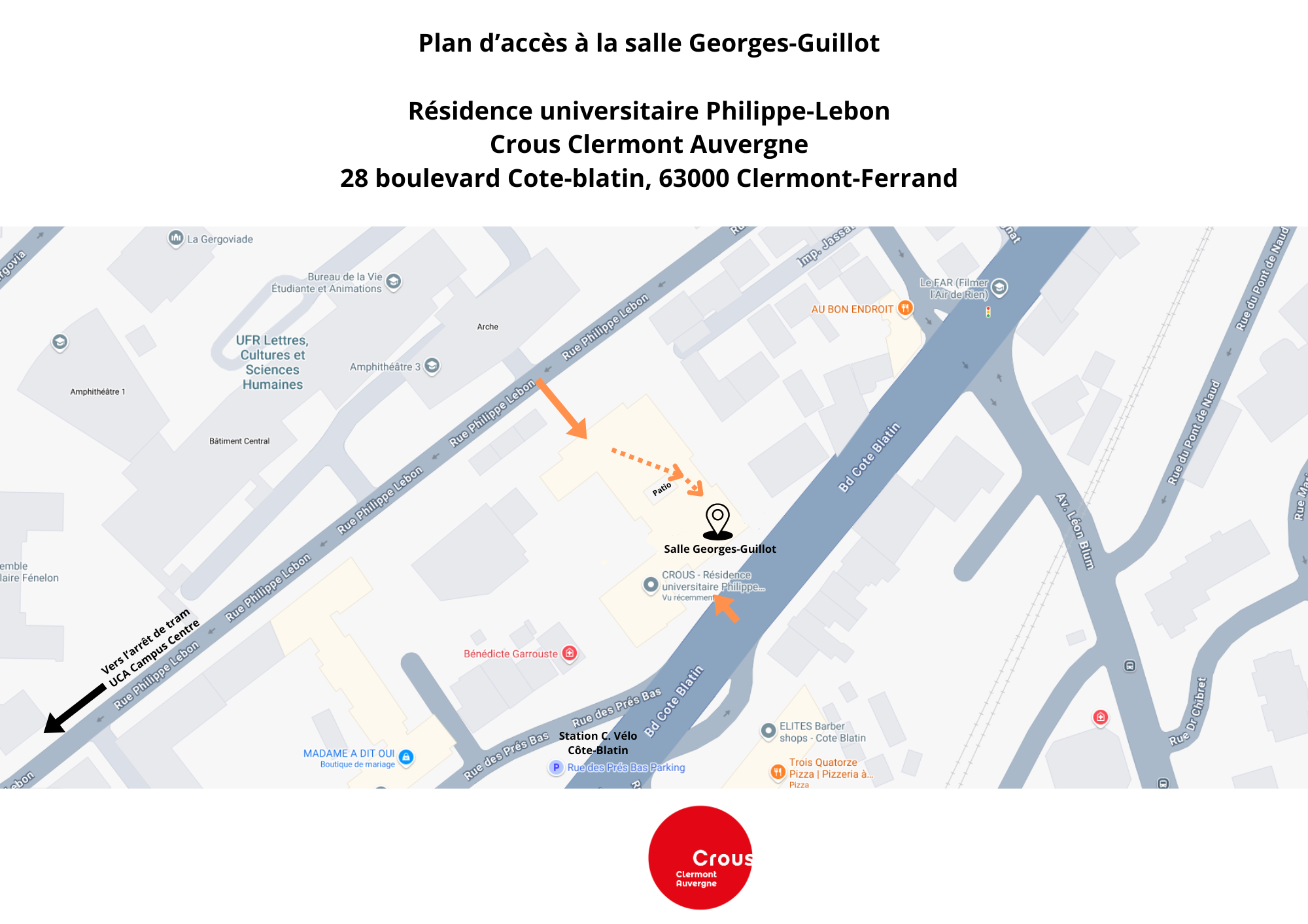 - Lieu : salle Georges-Guillot, Résidence universitaire Philippe-Lebon, 28 boulevard Cote-Blatin, Clermont-Ferrand (voir photos et plan ci-dessous).