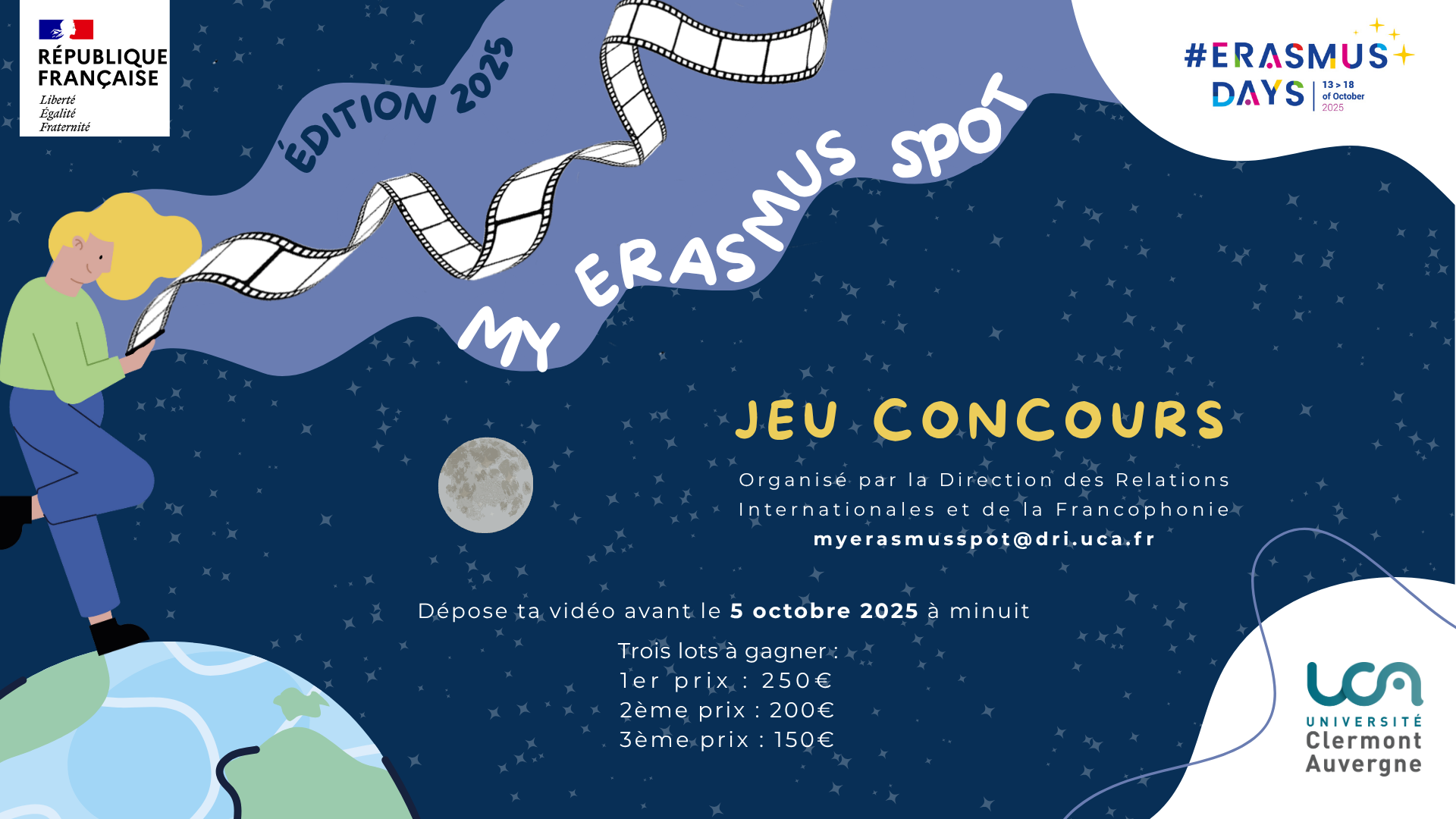 Le jeu concours ? My Erasmus Spot ? est organis¨¦ par la Direction des Relations Internationales et de la Francophonie (DRIF) de l¡¯Universit¨¦ Clermont Auvergne ¨¤ l¡¯occasion de la Journ¨¦e de la Mobilit¨¦ Internationale qui aura lieu le 16 octobre 2025. Il s¡¯agit d¡¯un jeu concours r¨¦compensant la meilleure vid¨¦o pr¨¦sent¨¦e par les ¨¦tudiants sur les b¨¦n¨¦fices de leur exp¨¦rience Erasmus+.