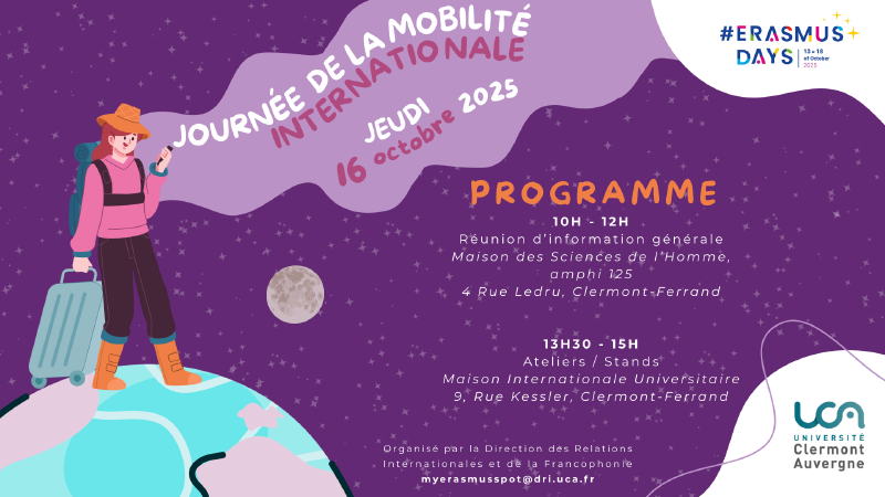 A l'occasion des Erasmus Days qui se dérouleront du 13?au 18?octobre 2025, la Direction des Relations Internationales & de la Francophonie organise la Journée de la Mobilité Internationale, le 16 octobre, 10h00 - 15h00.