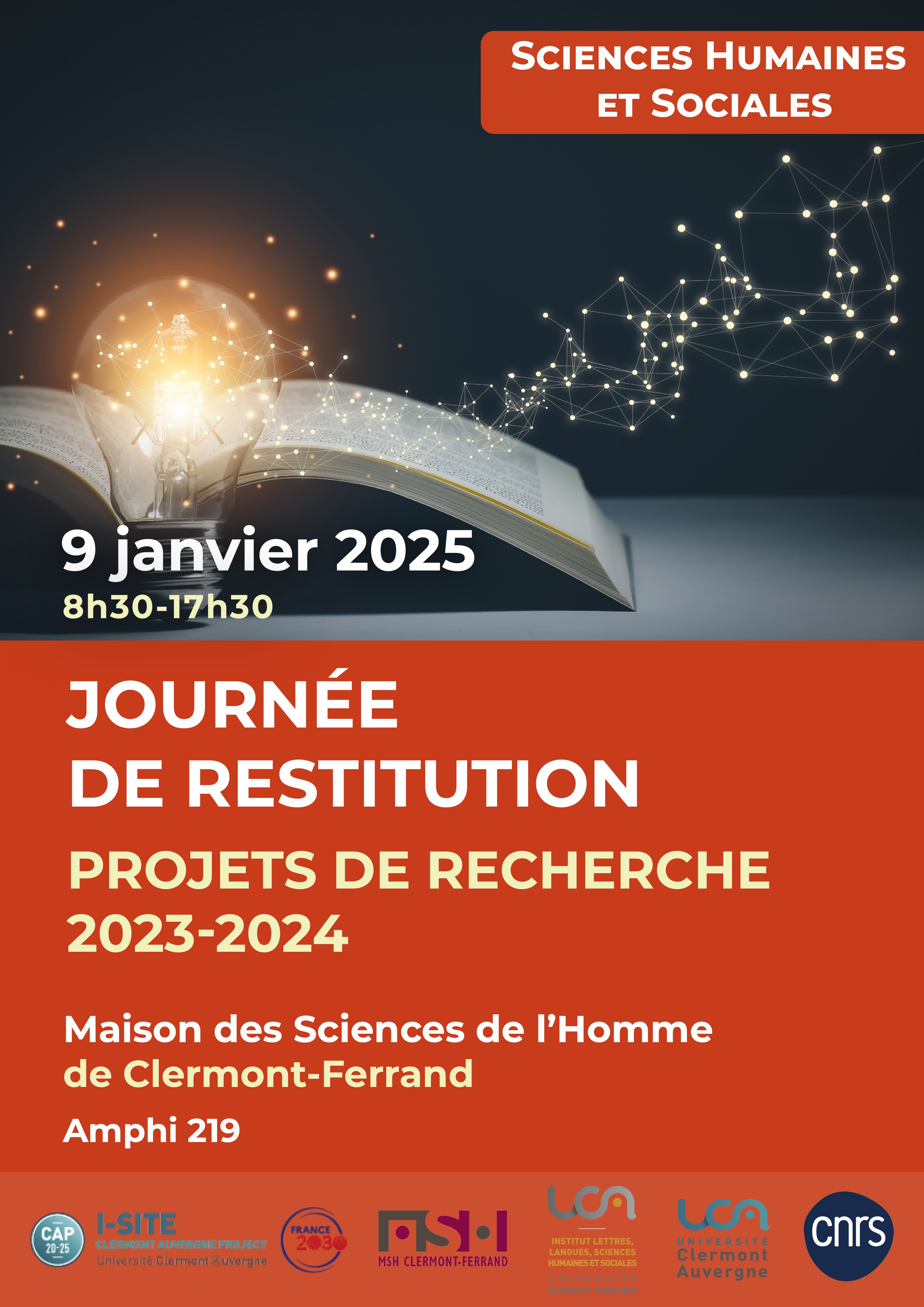 Le 9 janvier 2025, de 8h30 à 17h30, la Maison des Sciences de l'Homme de Clermont-Ferrand organise, amphi 219, la ? Journée de restitution de projets de recherche 2023-2024 ?.