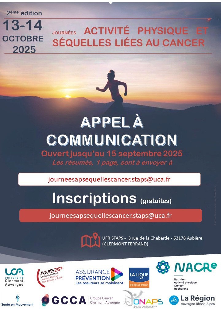 Les 13 et 14 octobre 2025, le laboratoire AME2P organise la deuxième édition des Journées Scientifiques sur l’Activité Physique et les Séquelles liées au Cancer, un événement fédérateur qui réunira chercheurs, professionnels de santé, étudiants et acteurs du sport-santé.