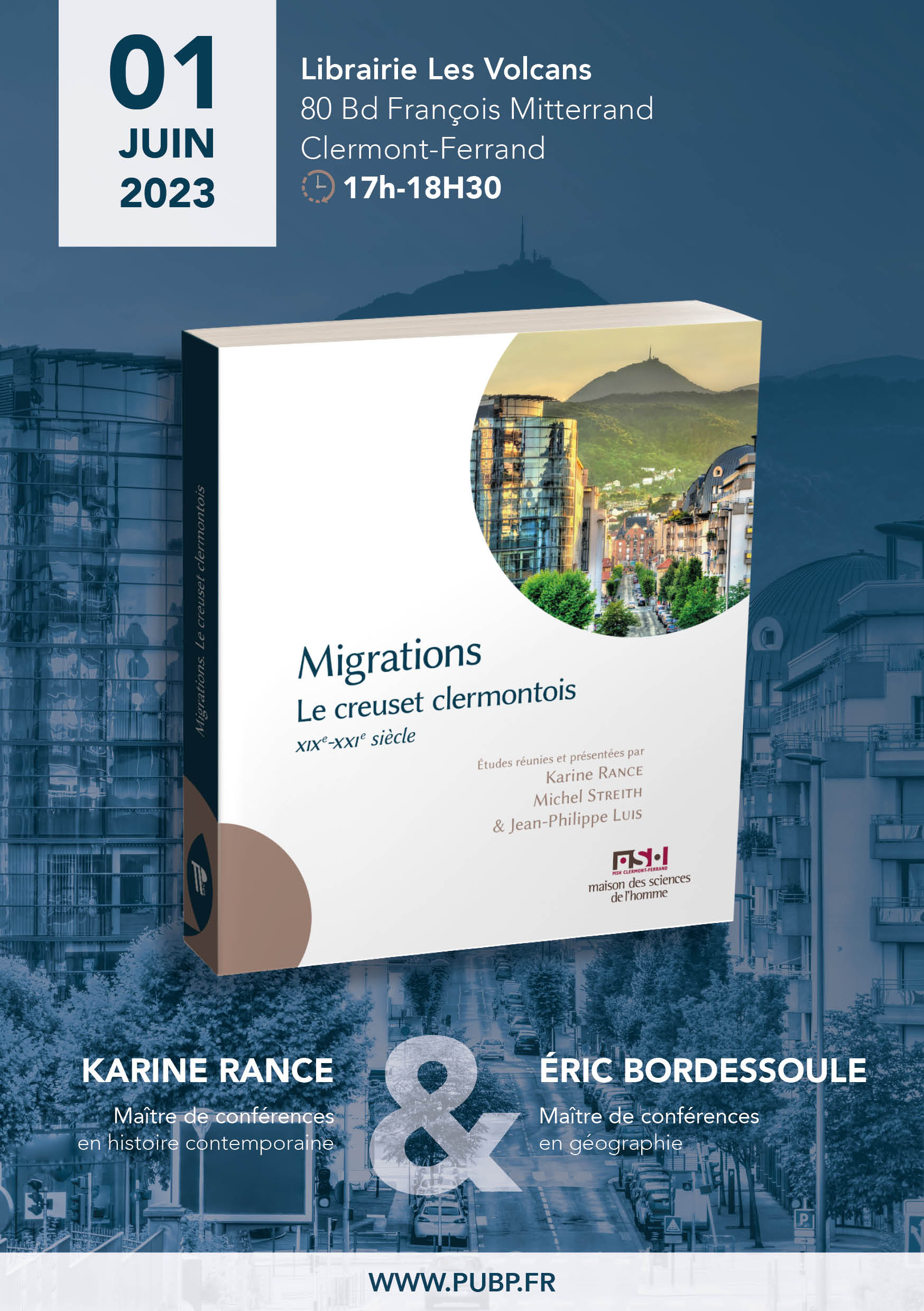 Une rencontre, présentation et dédicaces, de l'ouvrage collectif ? Migrations. Le creuset clermontois XIXe-XXIe siècle ? se tiendra à la librairie Les Volcans de Clermont-Ferrand le 1er juin, de 17h00 à 18h30.
