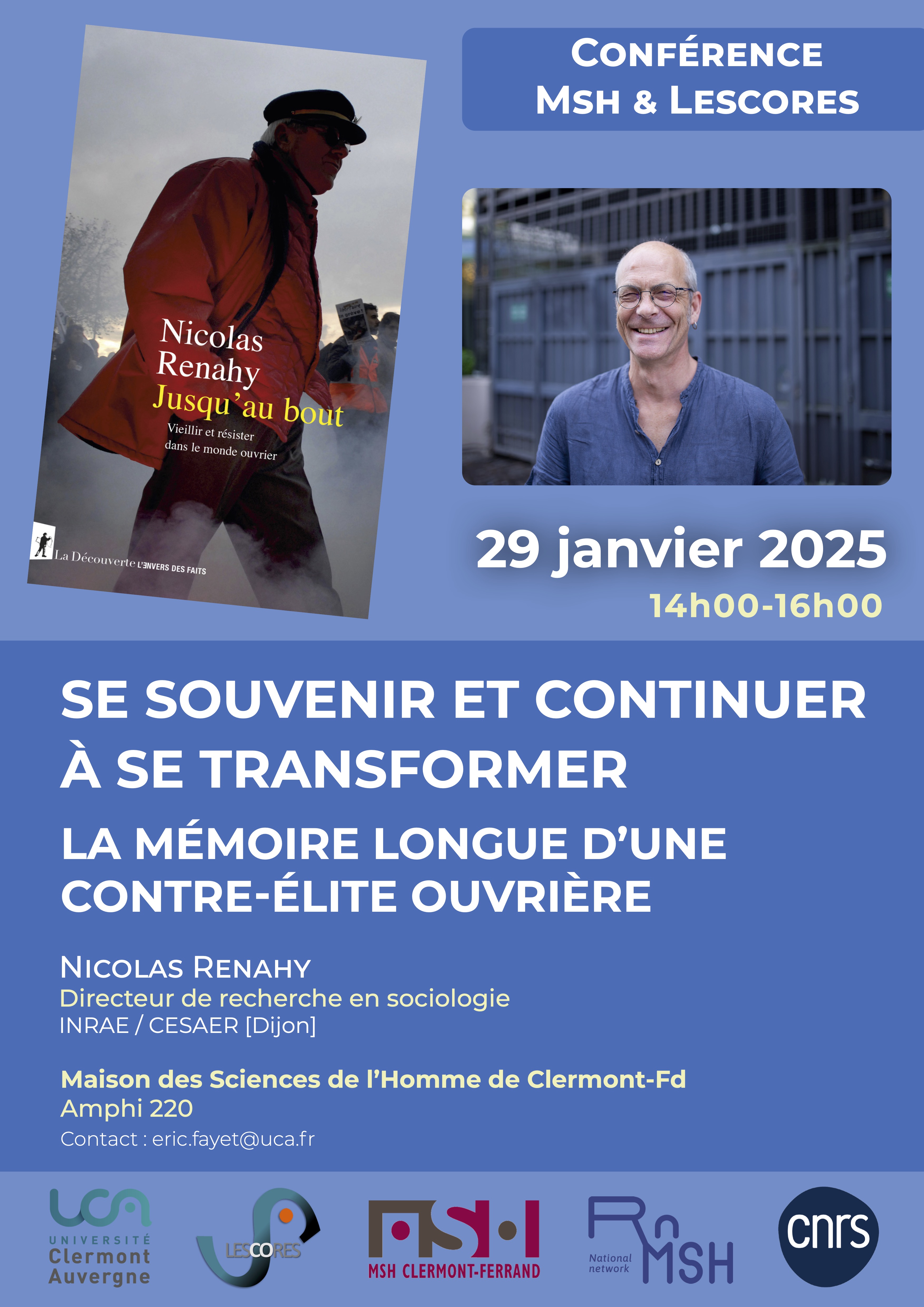 La Maison des Sciences de l’Homme de Clermont-Ferrand et le Laboratoire d’Etudes Sociologiques sur la Construction et la Reproduction Sociales (LESCORES) de l'Université Clermont Auvergne organisent une rencontre avec le sociologue Nicolas Renahy (INRAE/CESAER) le mercredi 29 janvier 2025, à 14h00, à la MSH (amphi 220). Nicolas Rehany interviendra sur le thème : ? Se souvenir et continuer à se transformer. La mémoire longue d'une contre-élite ouvrière ?. Cette conférence, en lien avec son nouvel ouvrage Jusqu’au bout. Vieillir et résister dans le monde ouvrier (Paris, La Découverte, coll. l’Envers des faits, 2024, 204 p.) sera suivie d'un échange avec la salle. Elle est ouverte à toutes et à tous.