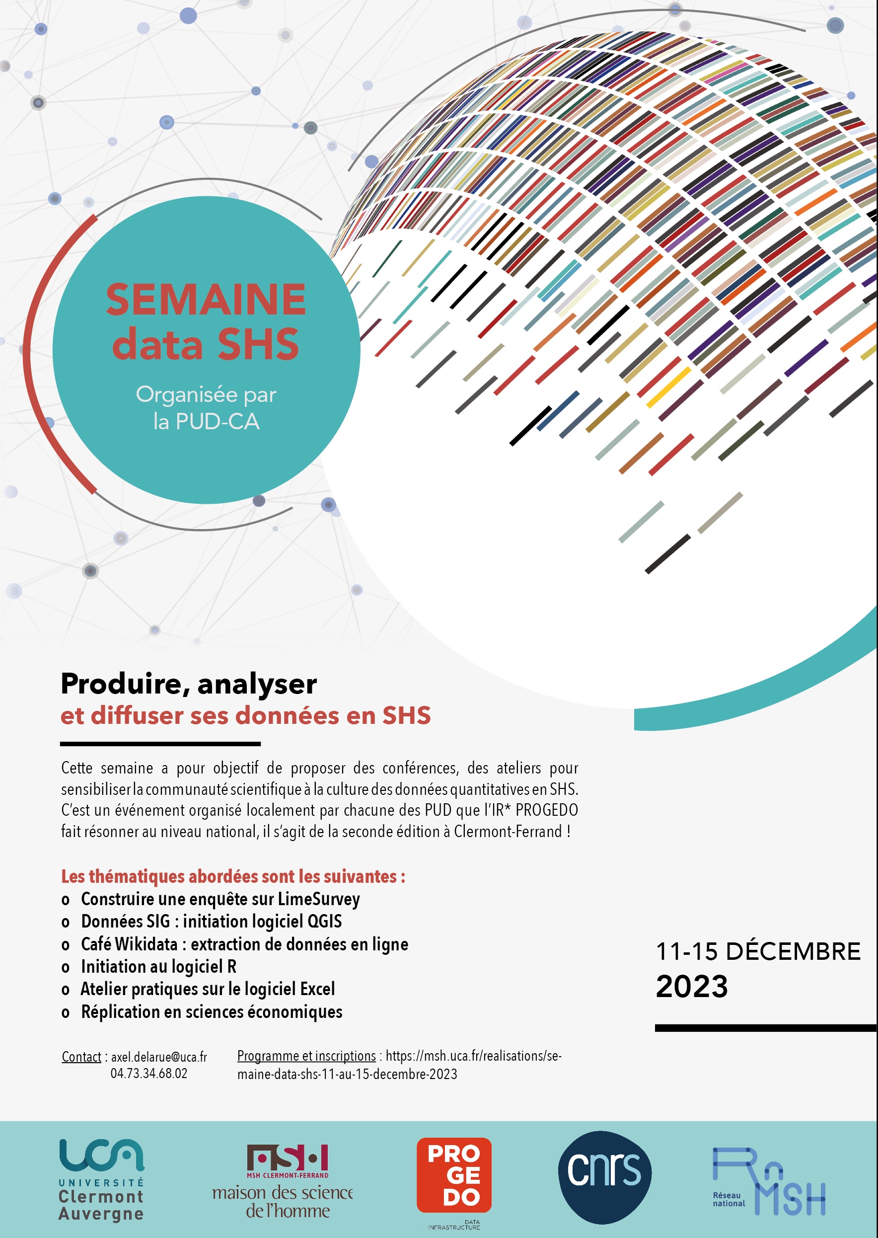 Du 11 au 15 décembre 2023, la Plateforme Universitaire de Données Clermont-Auvergne propose à la communauté scientifique une semaine de formation, d'ateliers et de conférences autour de l'utilisation des données quantitatives en SHS.