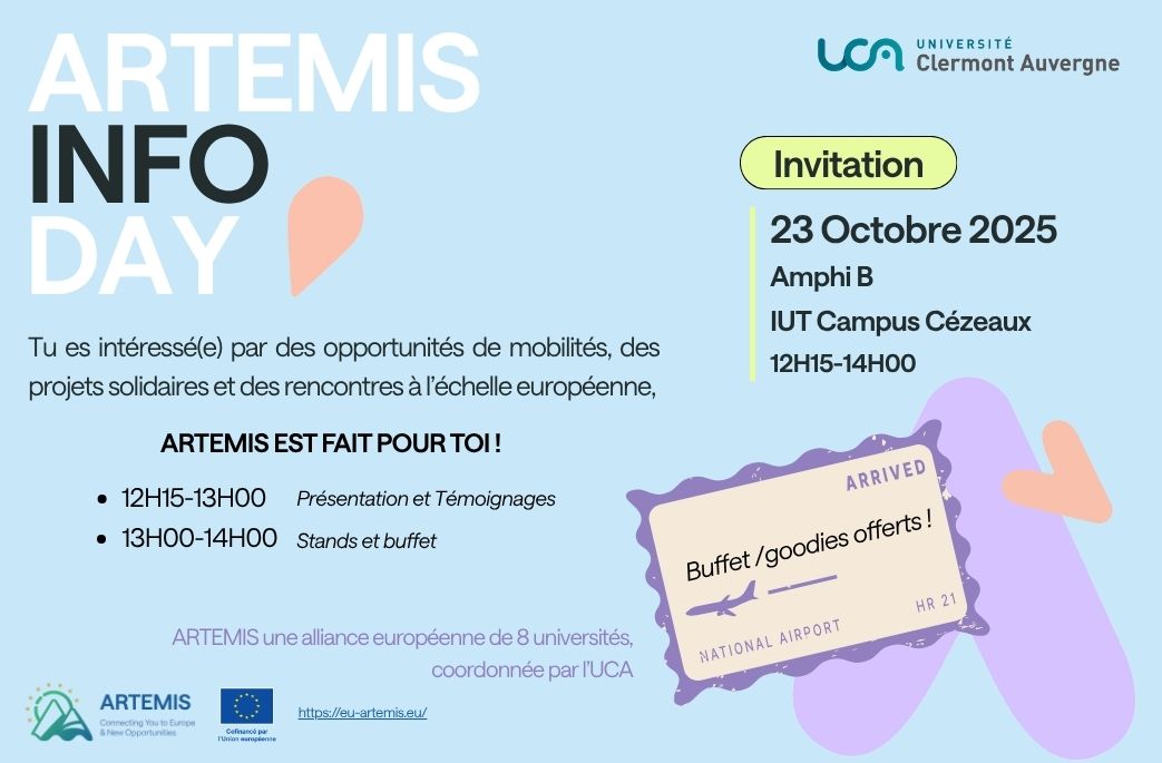 Participe à l’Info Day ARTEMIS, jeudi 23 octobre 2025 à Clermont-Ferrand, et découvre comment l’Université européenne ARTEMIS peut transformer ton parcours universitaire !
