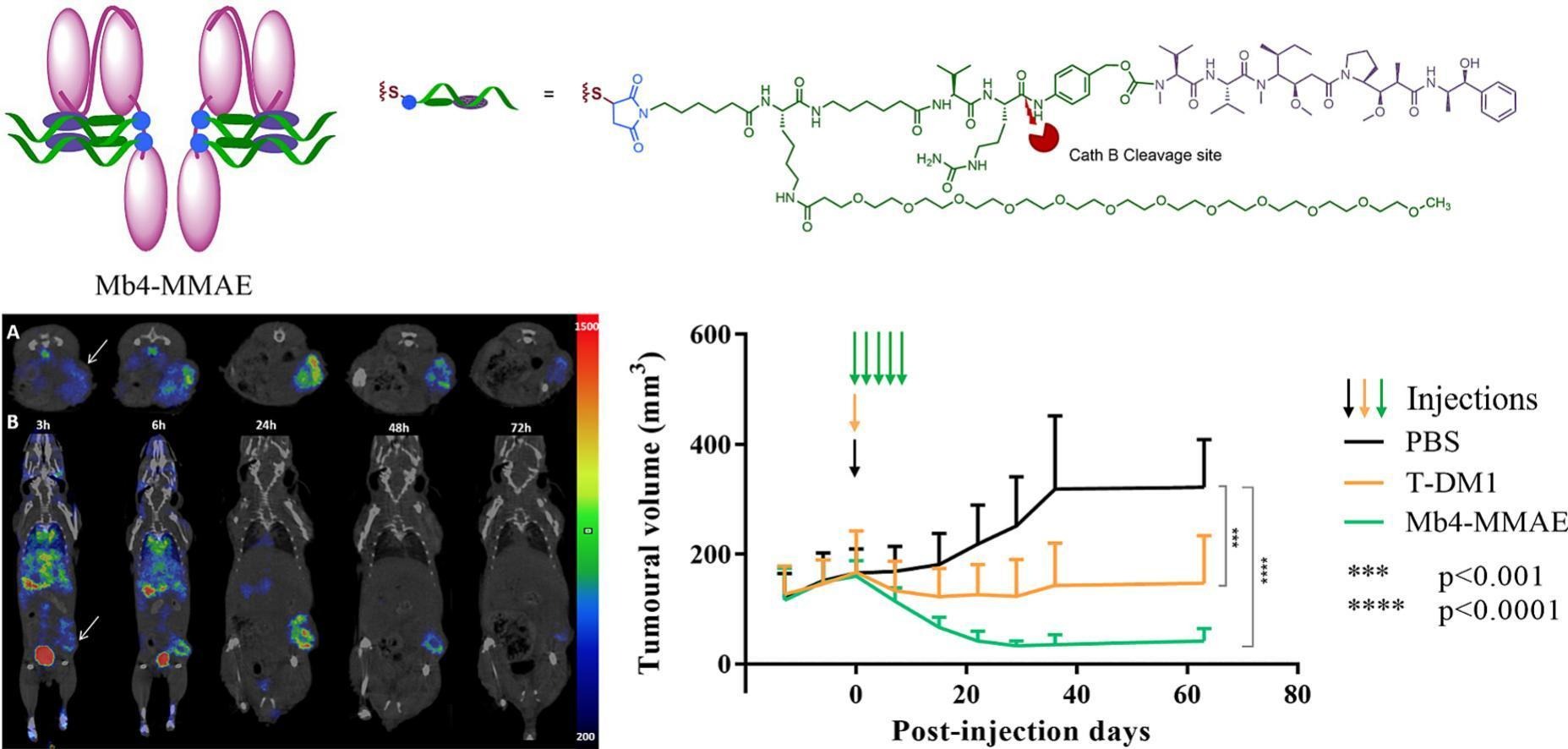 Branched pegylated linker-auristatin to control hydrophobicity for the production of homogeneous minibody-drug conjugate against HER2-positive breast cancer