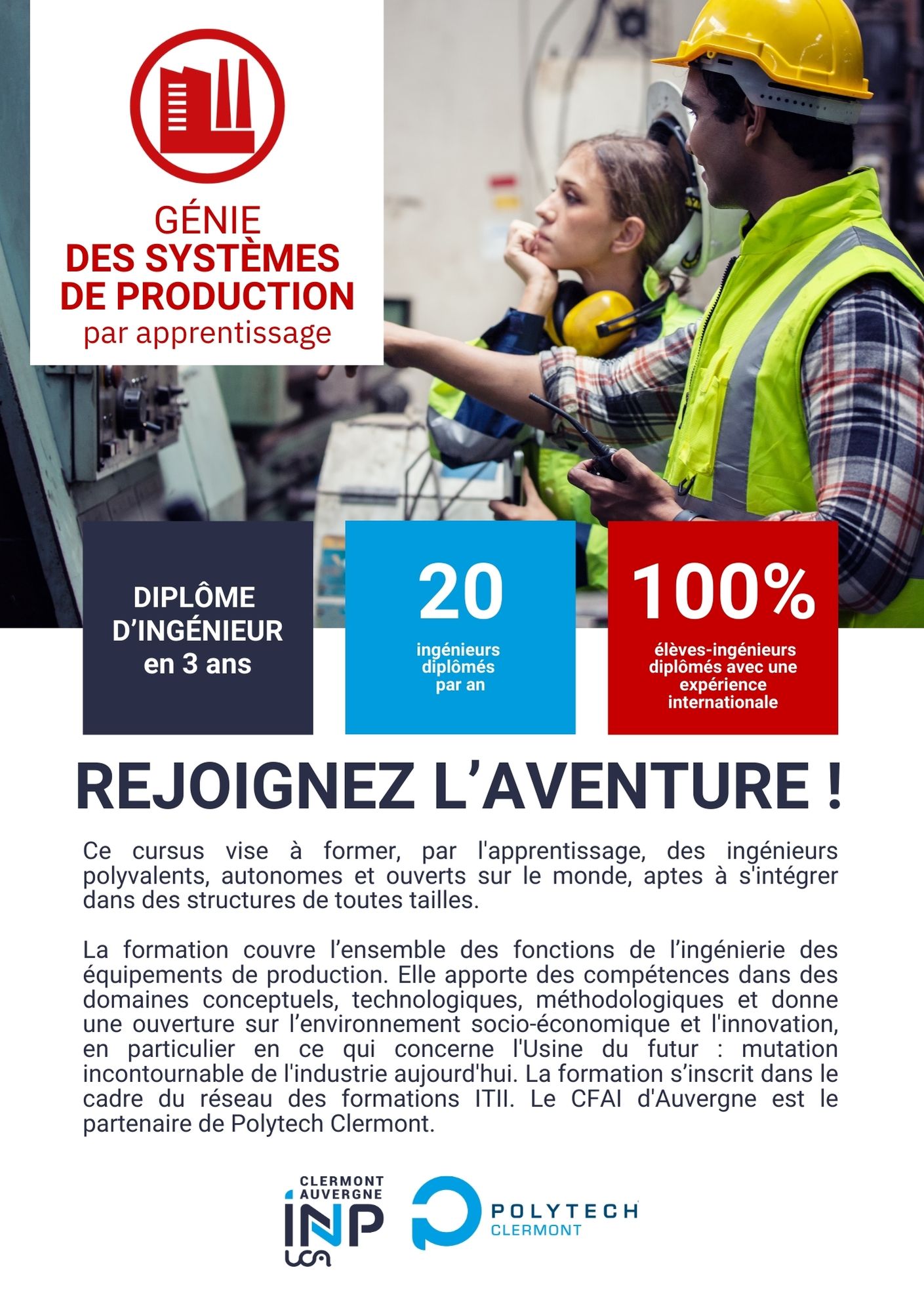 La formation en Génie des Systèmes de Production s’inscrit dans le cadre du réseau des formations ITII. Le CFAI d'Auvergne est le partenaire de Polytech.