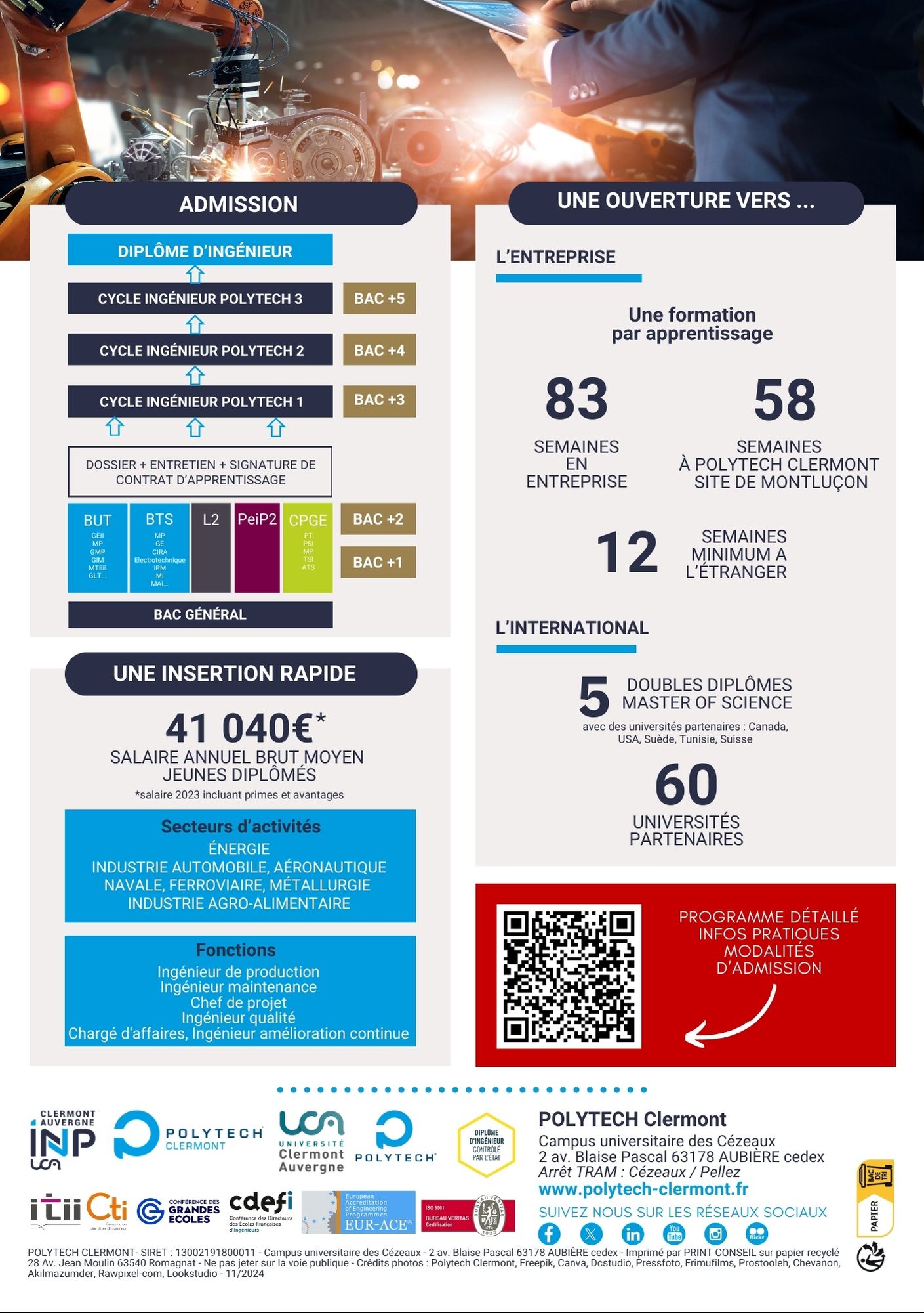 Le cursus est caractérisé par trois années d’études : sur trois ans, la présence en entreprise est de 84 semaines et la présence à Polytech Clermont (principalement sur le site de Montlu?on) est de 57 semaines.