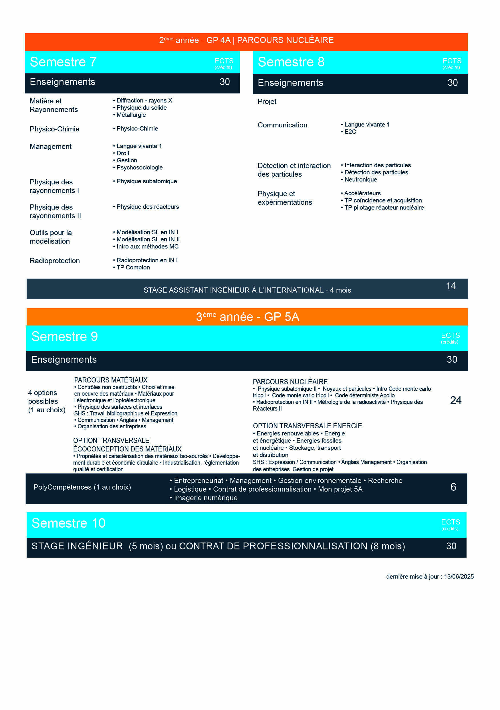 La création d’un parcours Nucléaire au sein du département Génie Physique en 4A et 5A en septembre 2025, s’effectue en appui sur le Master Ingénierie Nucléaire PTR-IPM de l’Institut des Sciences de l’UCA (EUPI), afin de répondre par la formation aux enjeux de la relance du nucléaire en France.
