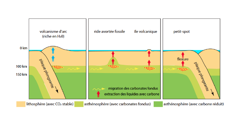 La composition de certaines laves produites en contexte océanique (rides avortées fossiles, petits spots, métasomatisme de points chauds), qui présente des carbonates fondus ou des traces d’un processus les impliquant, corrobore la proposition d’existence d’un niveau enrichi en carbone à l’échelle globale sous les océans.