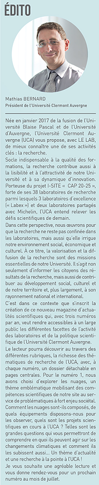Retrouvez un condensé de l'actualité de la recherche de l'Université Clermont Auvergne dans LE LAB, trimestriel qui met en lumière les innovations, les distinctions et le rayonnement de nos chercheurs et chercheuses.