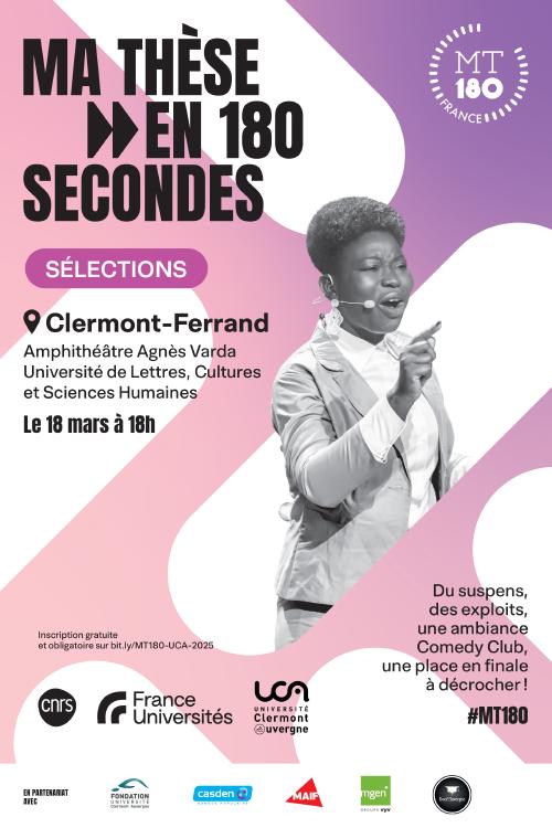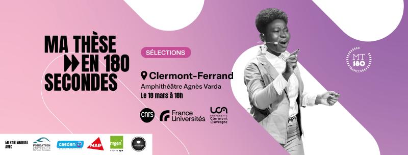 L'Université Clermont Auvergne et le CNRS Rh?ne Auvergne organise la finale clermontoise qui se déroulera, avec 11 candidats, le mardi 18 mars à 18h, dans l'amphithé?tre Agnès Varda de la Faculté de Lettres, Cultures et Sciences Humaines (29 bd Gergovia) et sera retransmise en direct sur la chaine Youtube de l'UCA.