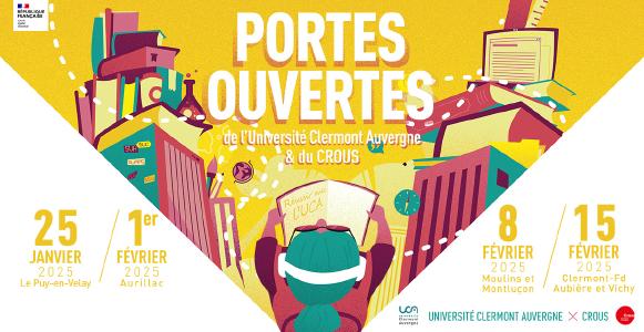 Si vous souhaitez vous orienter vers l'une des formations proposées par l'UCA, rendez-vous les 25 janvier (Le Puy-en-Velay), le 1er février (Aurillac), le 8 février (Montlu?on, Moulins) et le 15 février (Clermont-Ferrand, Aubière, Vichy) pour nos Journées Portes Ouvertes ! Plus d'informations à venir sur : uca.fr/jpo