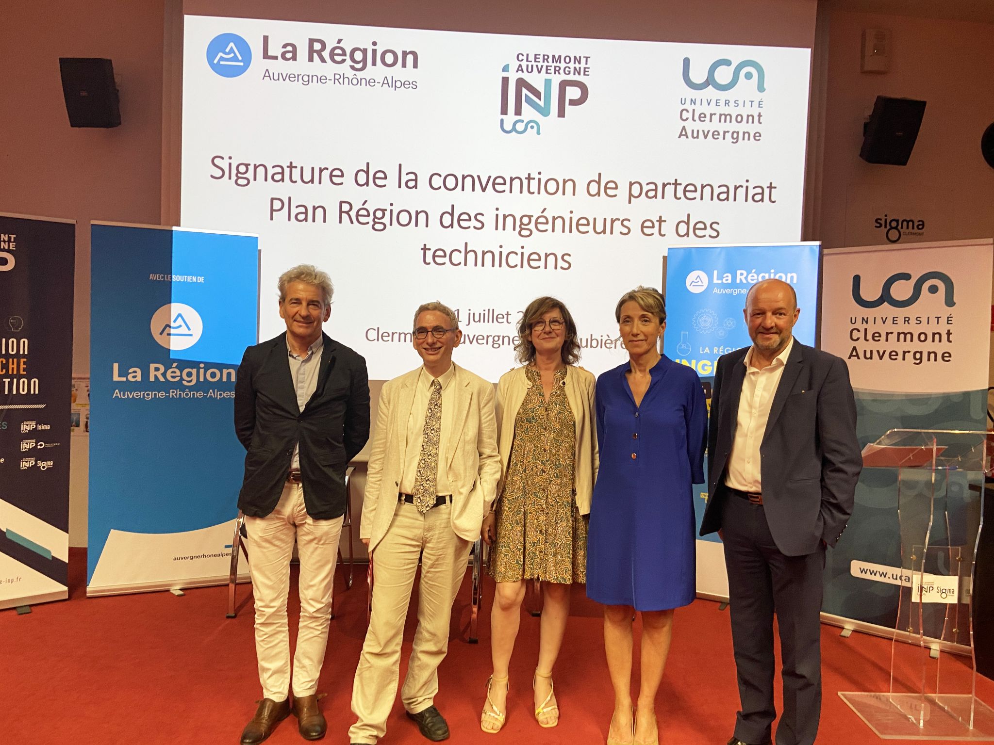 l’Innovation de la Région Auvergne-Rh?ne-Alpes, Mathias Bernard, Président de l’Université Clermont Auvergne et Sophie Commereuc, Directrice Générale de Clermont Auvergne INP ont signé une convention de partenariat au titre du Plan Région des ingénieurs et des techniciens.